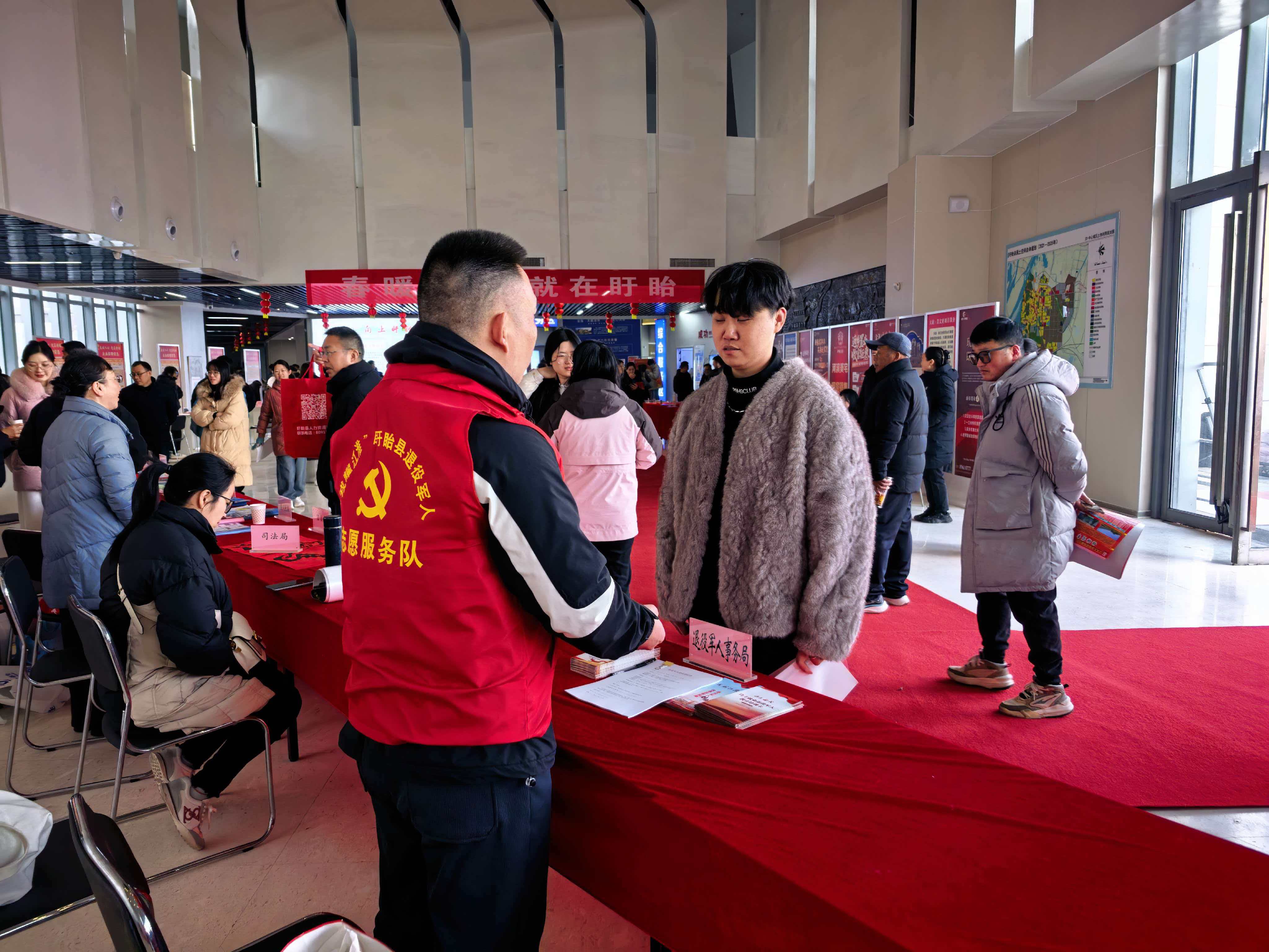 2月6日,盱眙县“戎耀江淮”退役军人志愿服务队在“春暖行动 就在盱眙”大型现场招聘会现场为退役军人解读就业创业相关优待政策。
