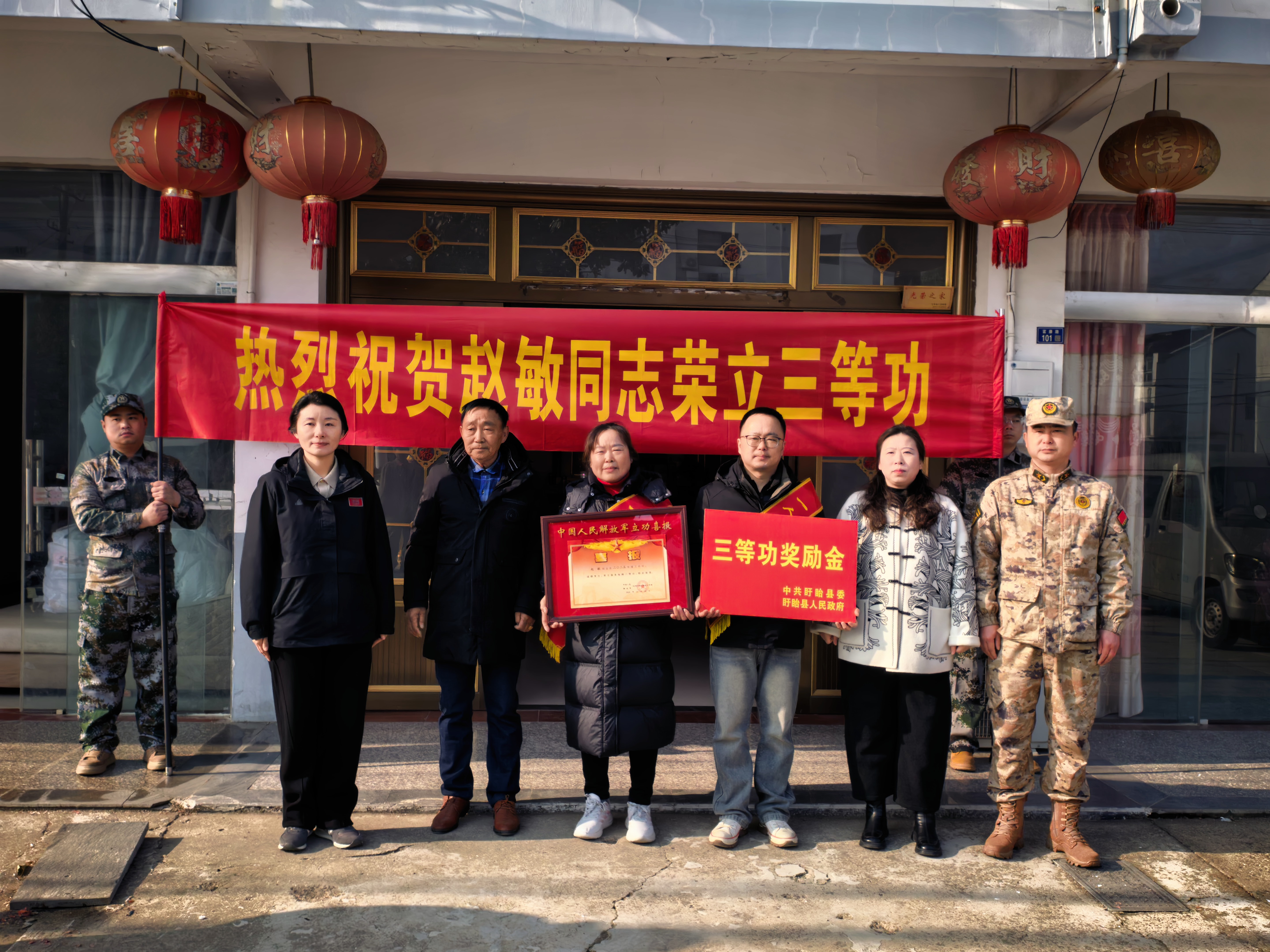2月11日,盱眙县退役军人服务中心、黄花塘镇退役军人服务站工作人员为荣立三等功现役军人家庭送喜报及奖励金。